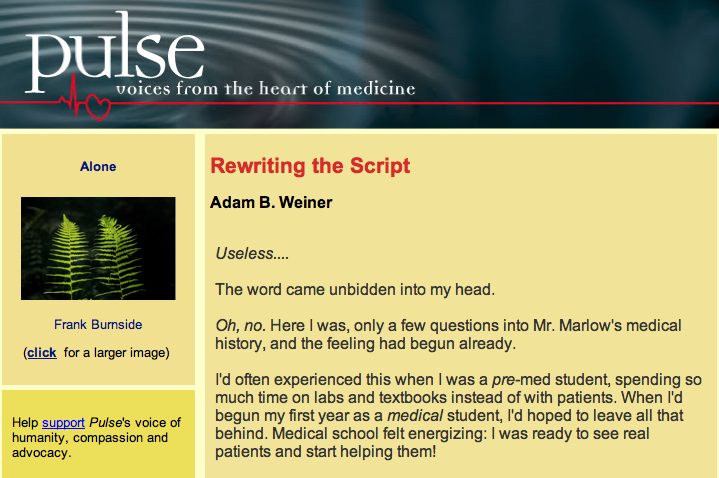 Great piece in online medical literary journal Pulse from third year Pritzker student Adam Weiner on the importance of listening to the patient experience–a contribution even a first year medical student may make.